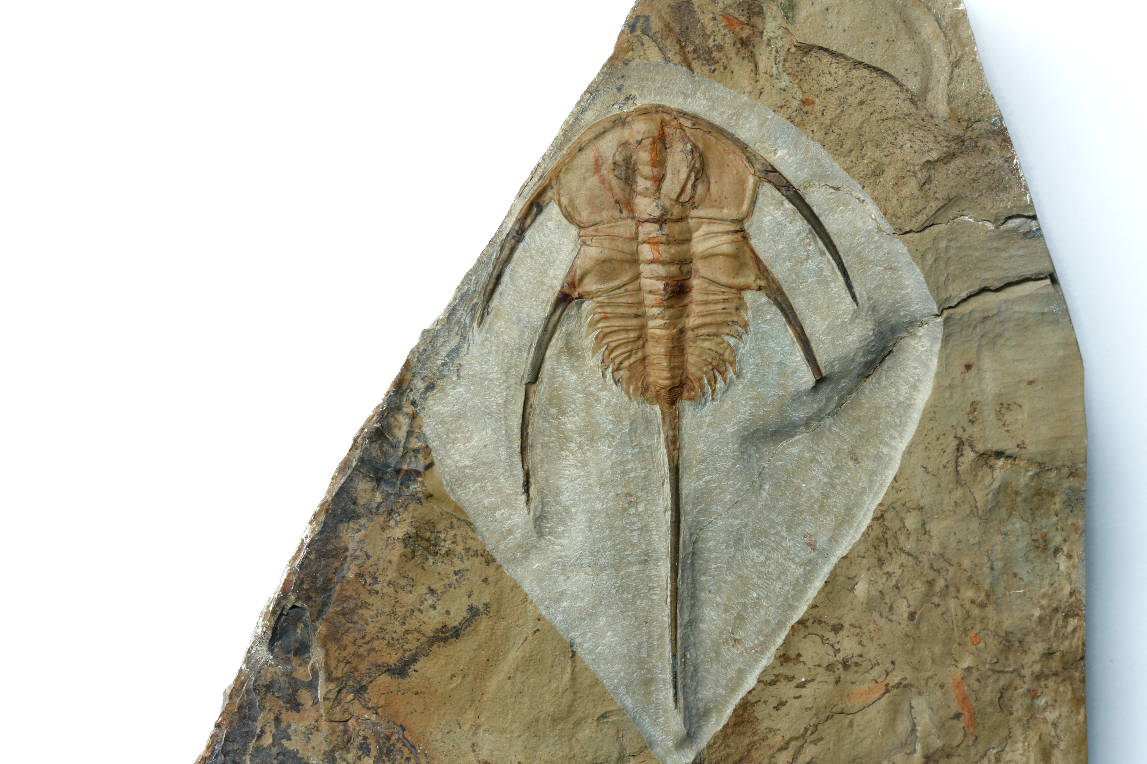 A large and highly sought after Bristolia bristolensis trilobite from the Lower Cambrian of Nevada. Bristolia are admired by collectors for their incredibly long, sweeping spines and for their rarity, with complete specimens very, very rare. Bristoliinae existed in a narrow temporal window near the middle of the Lower Cambrian, making them scarce with just a few sites across the globe where they can be found. This specimen is naturally light orange in color, measures 7cm including the telson (tail spine) and is perfect, save for the tip of the right macropleural spine. The delicate opistothorax is present with its segments visible pressed into the surface of the base of the telson, and on either side. This specimen was collected in the late 1990’s. Excellent opportunity to grab a large example of this species.