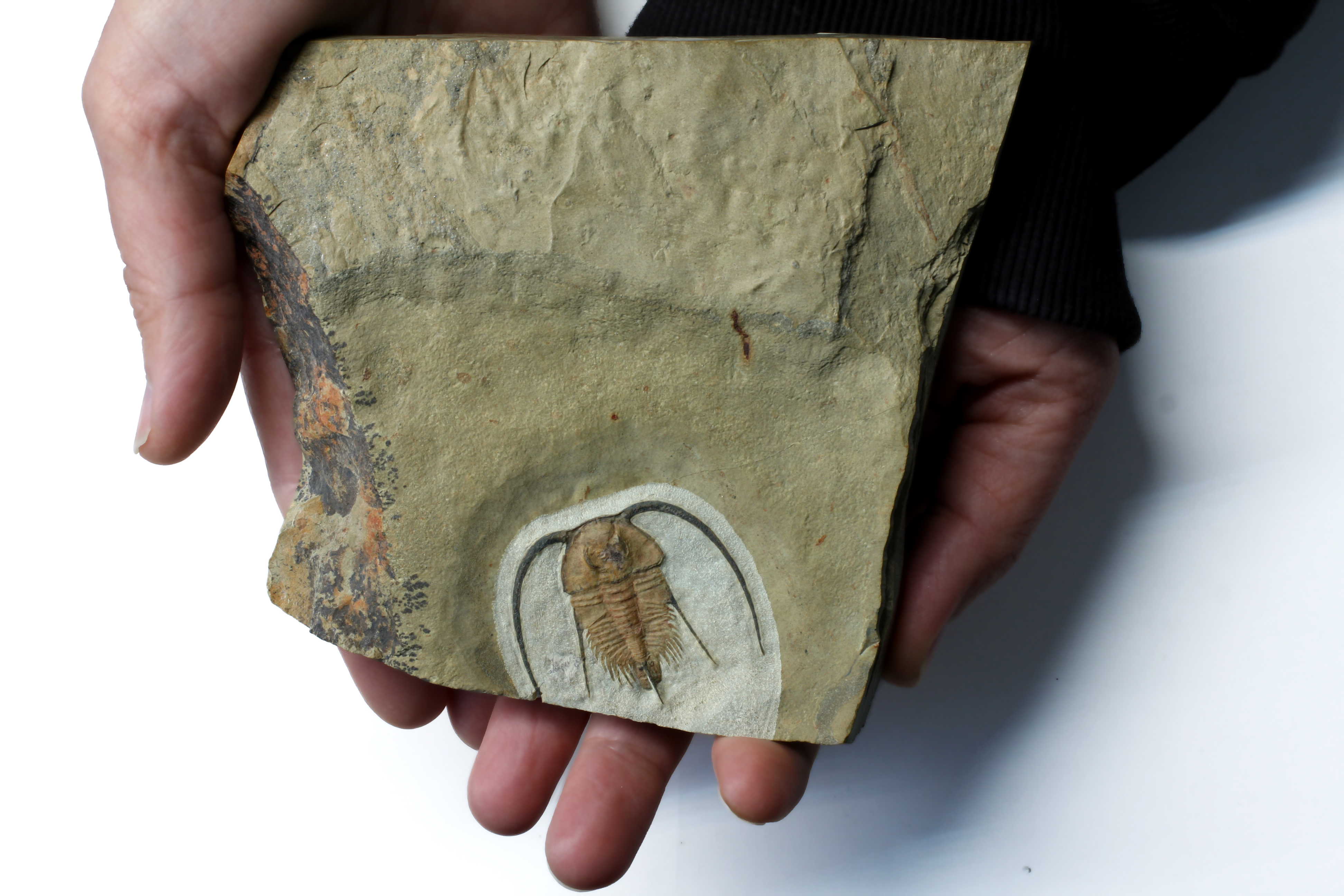 Few fossils are more sought after than the extremely rare, some would say “mythical”, Bristolia insolens trilobite. Bristolia insolens features highly unusual ram-horn-esque genal spines emanating from the front of the cephalon, a small thorax and a rather large secondary thorax (opistothorax) situated beneath the tail spine. Complete examples of this species may number as few as a dozen, with truly exceptional specimens such as this one even less so. This specimen measures 3.5cm and features perfect anatomy including the large, complete opistothorax. One is hard pressed to find a better example of this species. No restoration.