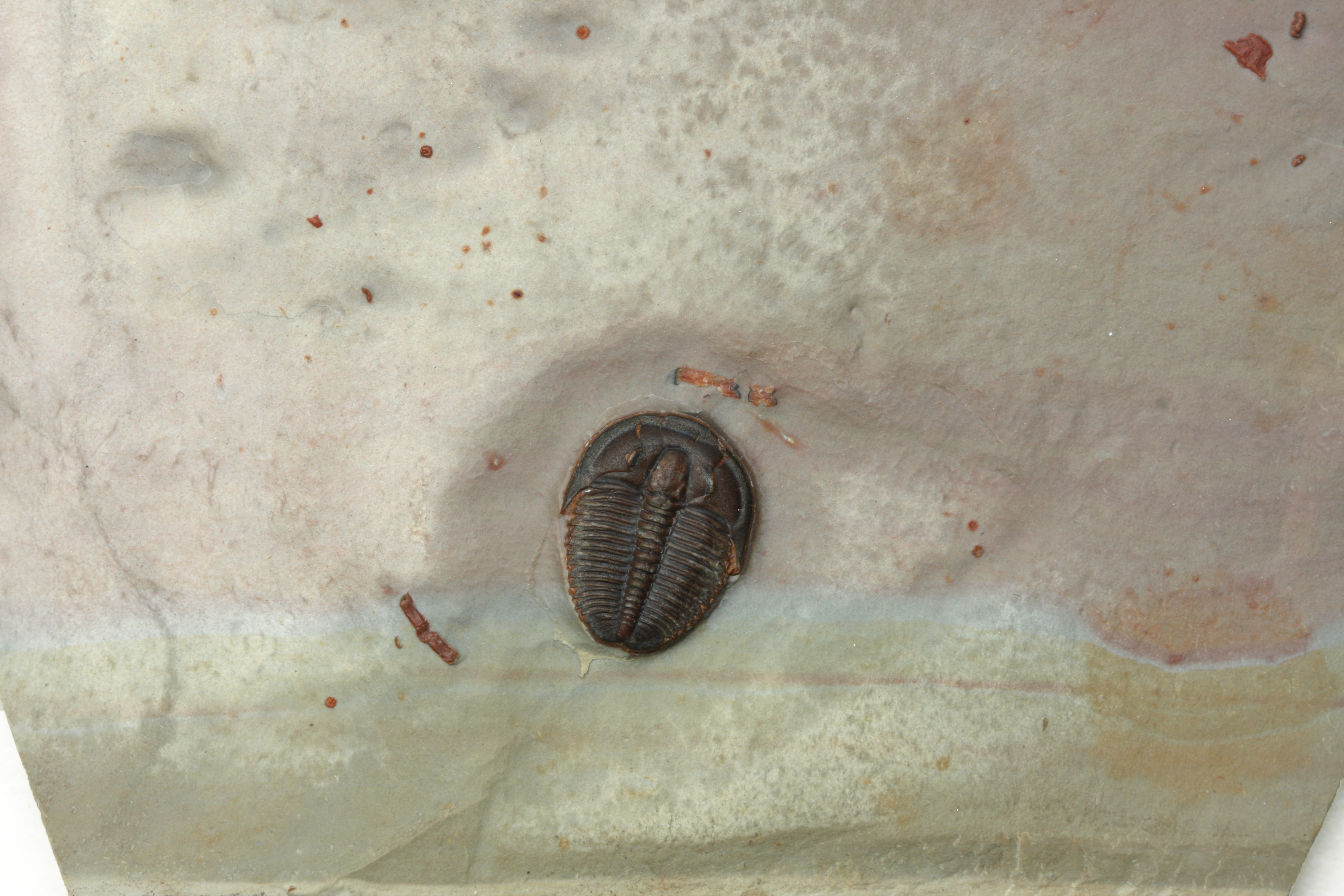 An extremely well preserved red Elrathia kingii trilobite from the Wheeler Shale of Utah. The vivid red trilobite is situated on a pink and green matrix, making it very aesthetic. A small red agnostid trilobite (Itagnostus interstrictus) sits to the far left of the plate.