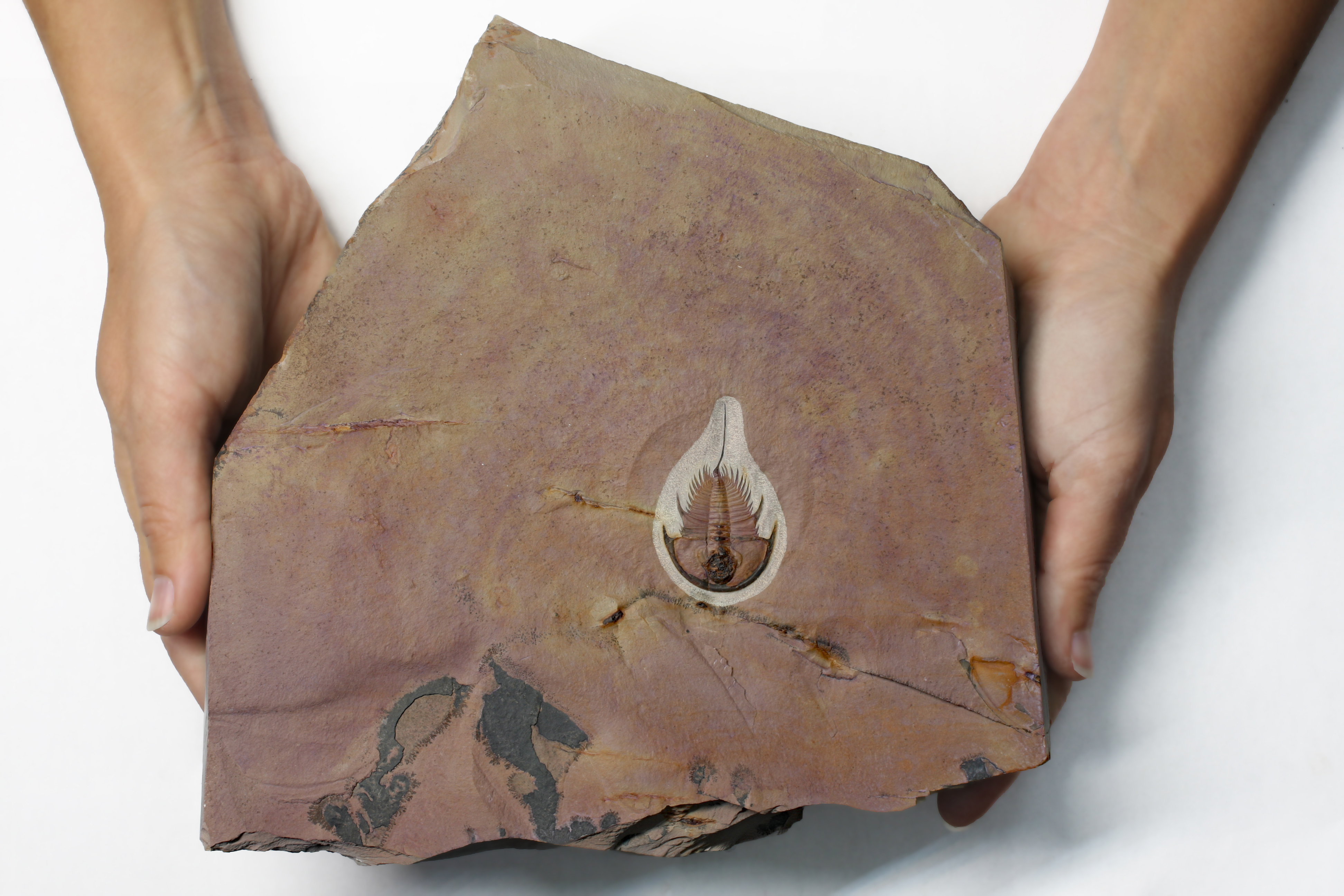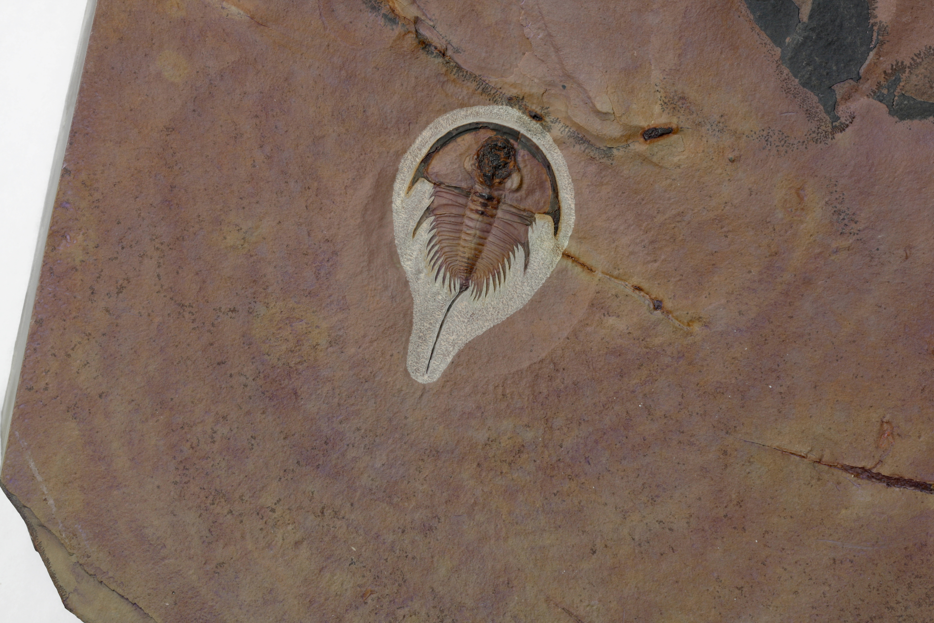A rarely seen Olenellus species from the Lower Cambrian of Nevada. Fragmentary remains of Olenellus howelli are very uncommon, with complete specimens likely numbering a half a dozen or so. This specimen is fantastic, showcasing the species unusual wide cephalon and short spines. It is preserved in stunning purple, with orange and yellow highlights. Heavy iron elements have preserved the glabella and the first few axial segments of the thorax. Small axial spines/nodes can be seen on the first three axial rings, disappearing and then reappearing on the 10th segment and continuing to the terminal thoracic segment before the telson. A small but notable opistothorax (secondary thorax) can be seen pressed into the beginning of the telson or tail spine. The telson emerges as a robust triangular spine, slightly curving down its length. This is an exceptional example of this rarely seen species.