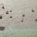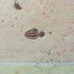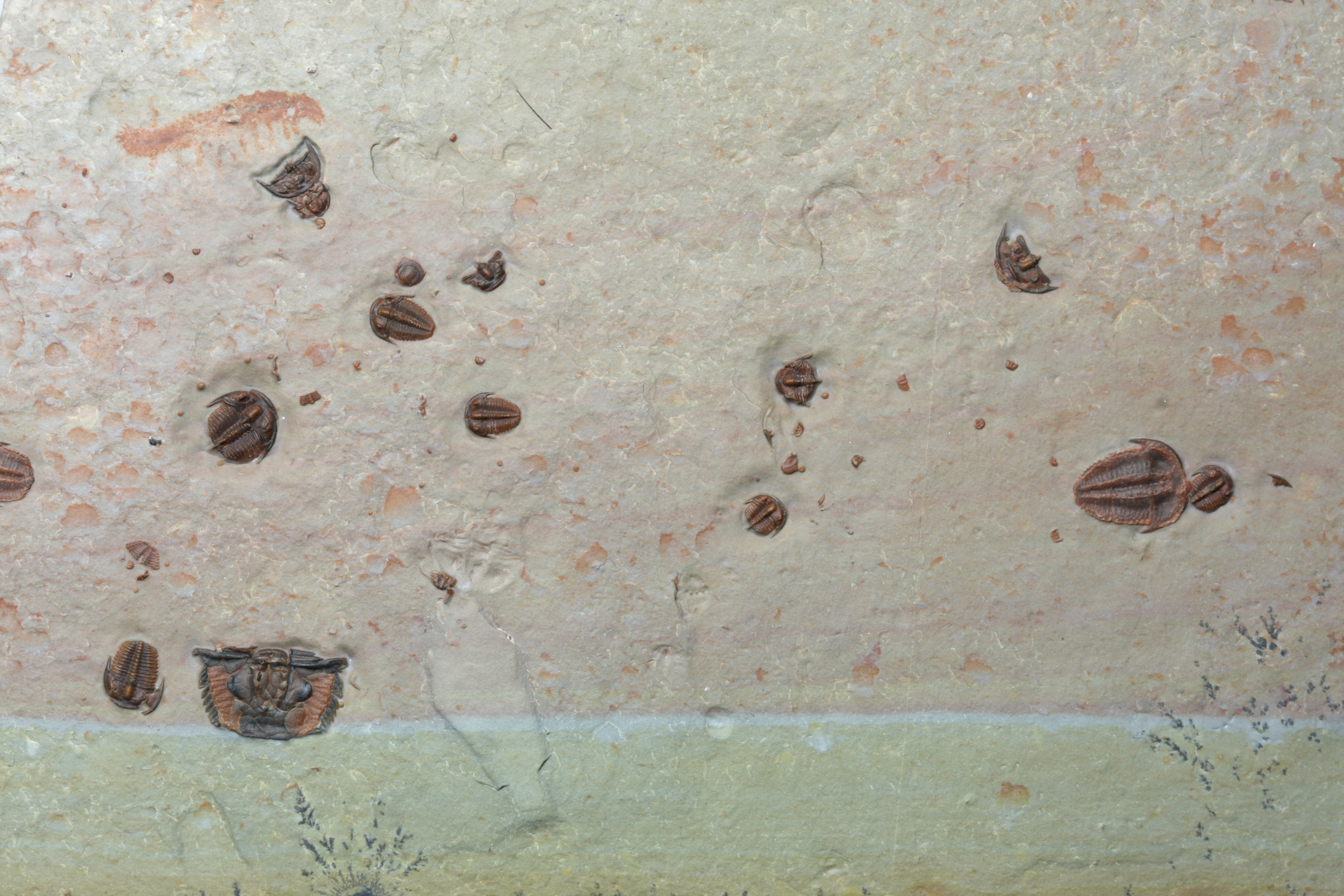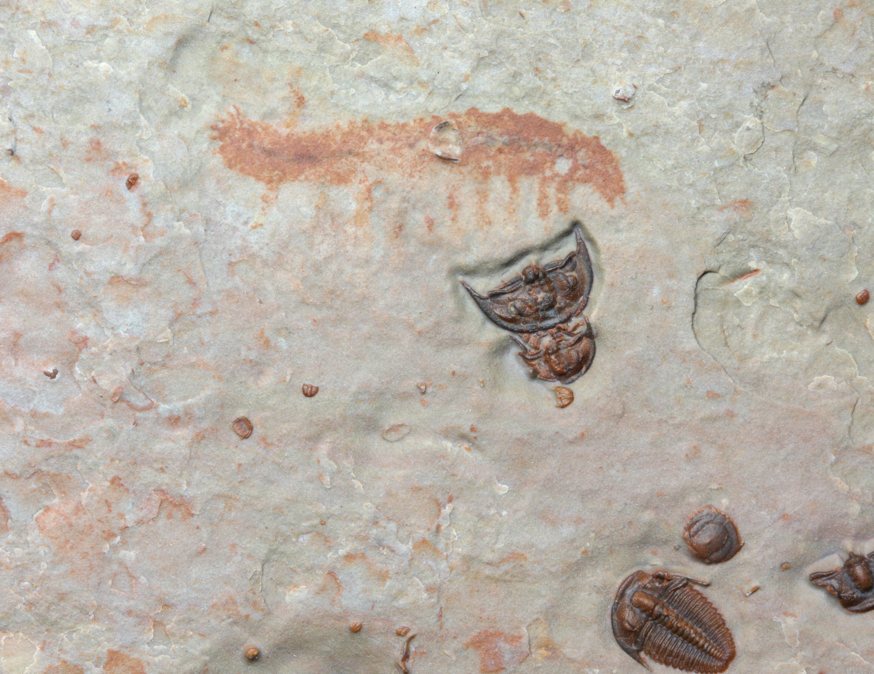 From the upper Wheeler Formation of western Utah comes this extraordinary plate featuring some 20 or so Bolaspidella housensis trilobites, along with an extremely rare Aysheaia sp. lobopod. ย Preserved in stunning red colors, the fossils on this plate are very aesthetic. ย The lobopod measures 1.8cm and features small spines extending from the front of the head, 2 grasping appendages, followed by numerous legs running down the trunk of the body. ย The film-like preservation, while somewhat faint, is nothing short of incredible, and is a stark contrast to the hard shelled trilobites sharing the plate. ย Other soft body fossils pepper the plate, including the pterobranch Yuknessia simplex (far right), as well as countless pellet-like dots which may be algal in origin.