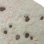 The Bolaspidella trilobites dominate the rock. ย Several perfect examples of the spiny species are present, including a tiny complete 1.5mm meraspid. ย The matrix features the rose color bordered by lime green at the bottom with typical light blue interference line separating the two colors.