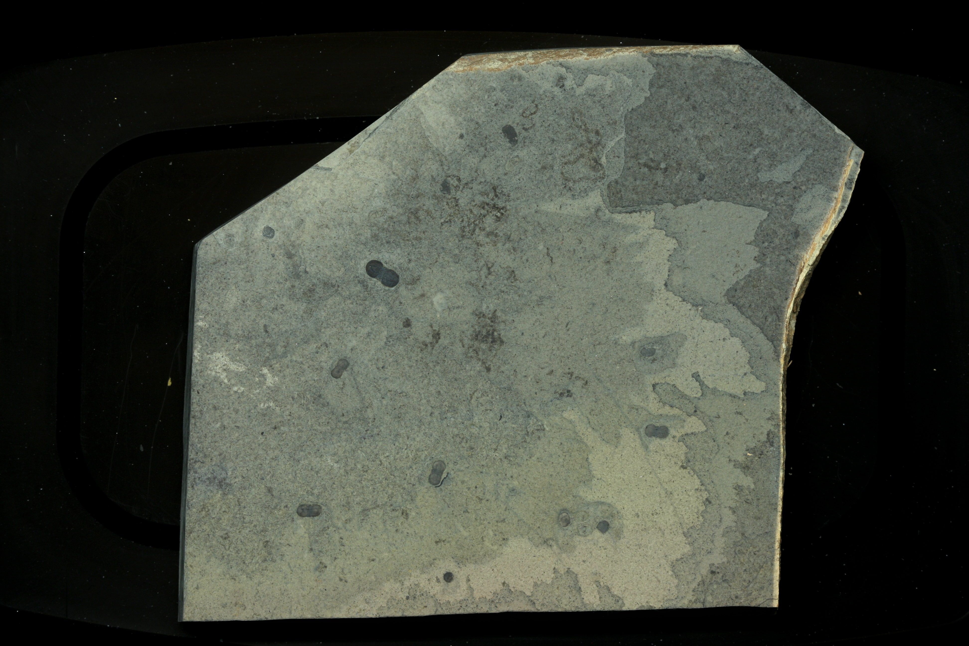 A nice multi plate featuring multiple agnostid trilobites with associated Marpolia (algae or cyanobacteria) tufts scattered about. ย Soft tissue preservation of the Marpolia mixed with the shelly agnostids makes for an interesting display piece.