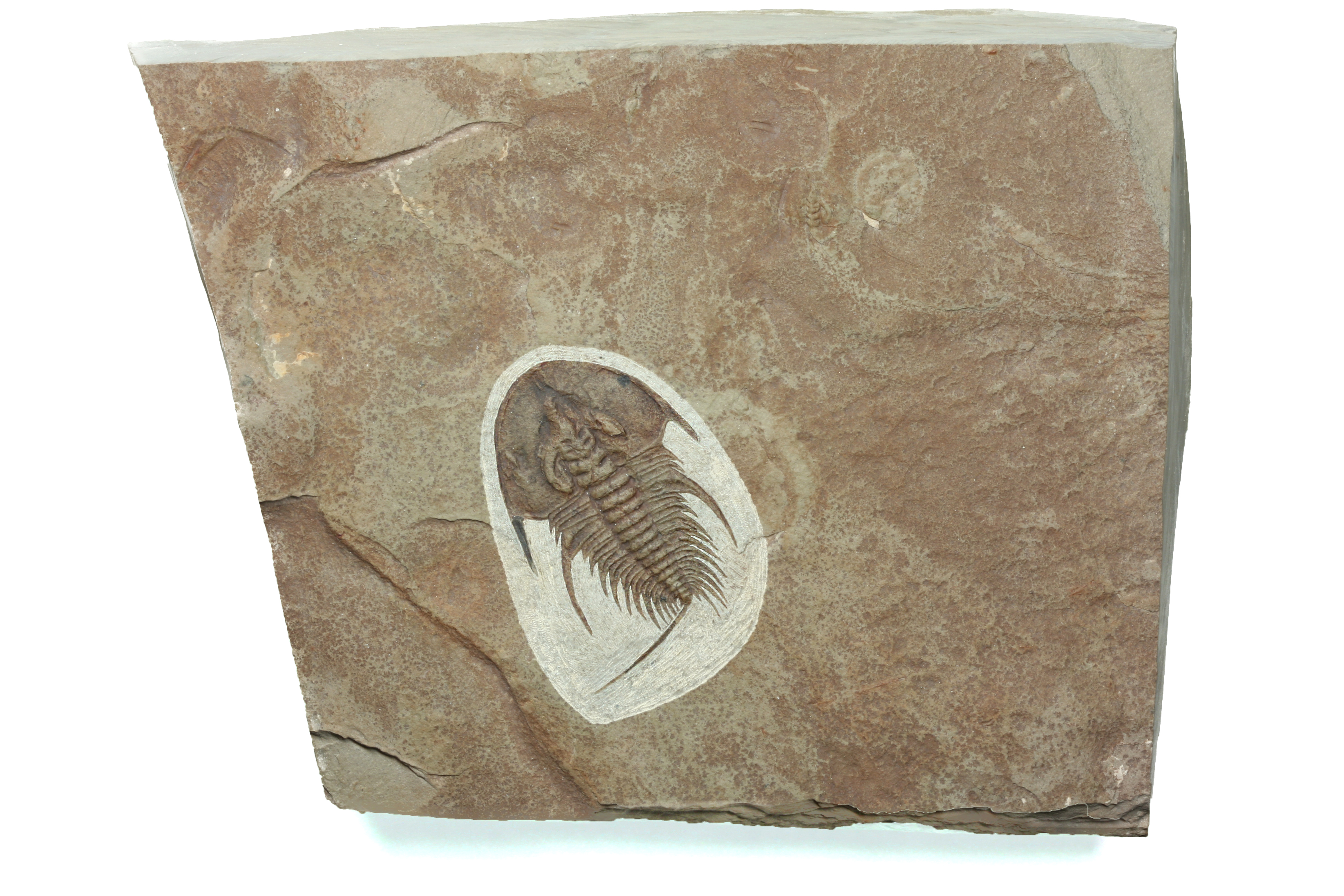 An outstanding, relatively large specimen from the Lower Cambrian. This ancient Olenellus clocks in at over half a billion years old. Named for the Chief Mountain Range in Nevada, this specimen is perfect and features a long tail spine, whipping to the side in dramatic fasion as well as the classic elongated, spaceship-like cephalon. One of the best examples of this species we’ve seen.