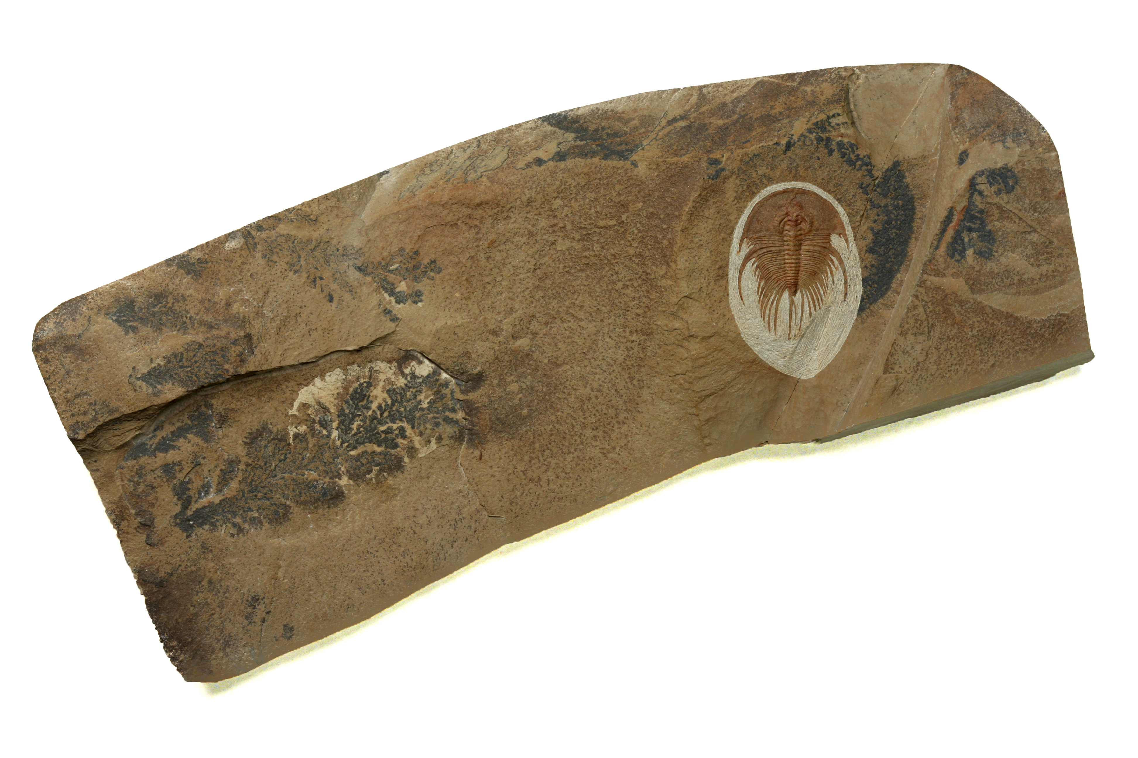 The highly sought after Olenellus fowleri. Good examples of this rare Lower Cambrian species are hard to find. This orange specimen is expertly outlined for maximum contrast against its natural matrix, which is adorned with flower-like iron manganese dendrite crystal growths. This is a nice opportunity to acquire this epic species without breaking the bank.
