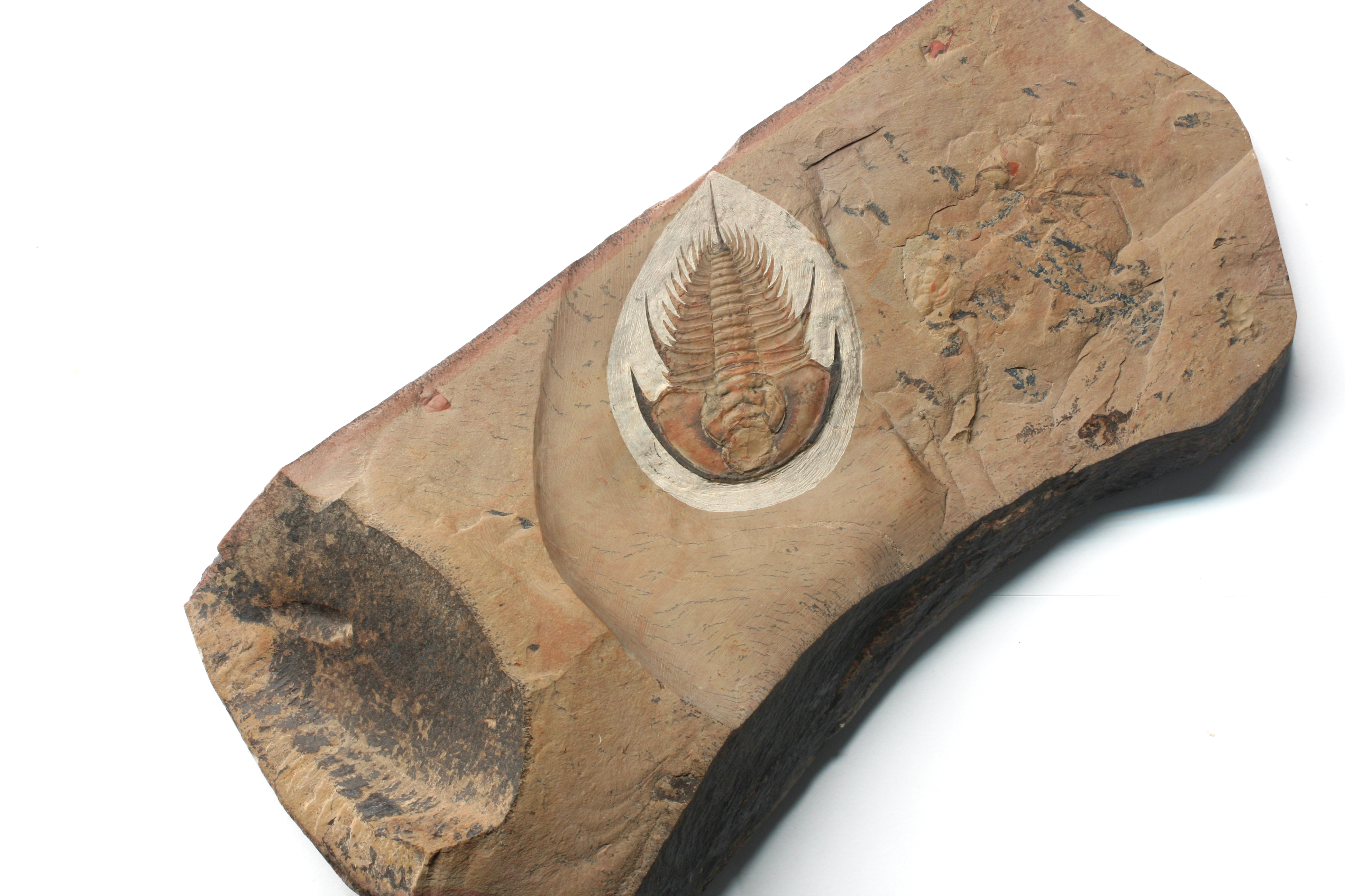 A large 6.1 cm Olenellus gilberti trilobite from the Delamar Expanse, Lower Cambrian, Nevada. The attractive orange specimen sits on a natural block covered with iron-manganese dendrites and other Olenellus pieces and parts. Tiny tubes structures are clearly preserved on this specimen. These “hero” specimens as these larger examples on natural dendrite covered plates are referred to, are dwindling in availability.