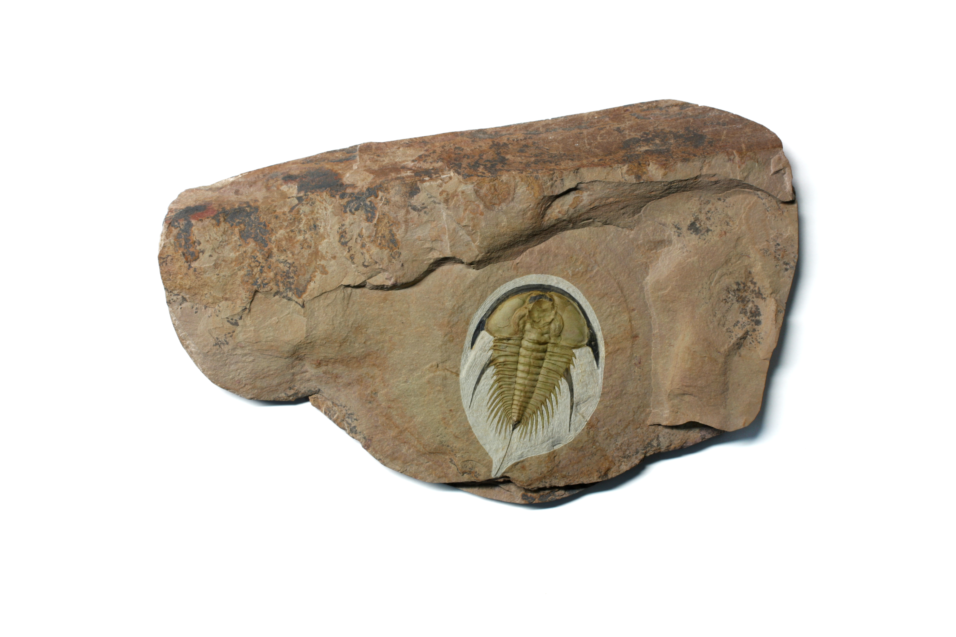 An unusual Olenellus with natural green color from the Delamar Mountain range in Nevada. Collected some 30 years ago, this specimen is large, measuring 5.5 cm long. Situated on a reddish orange matrix with dendrite crystal growths, the natural green color of the trilobite is subtle but very attractive. This specimen shares morphological features of both Olenellus terminatus and Olenellus gilberti, with short genal spines and long, sweeping pleural spines and wider cephalon and thorax. On the far edge of the eastern-most portions of this unit, the species often diverge from their textbook descriptions.