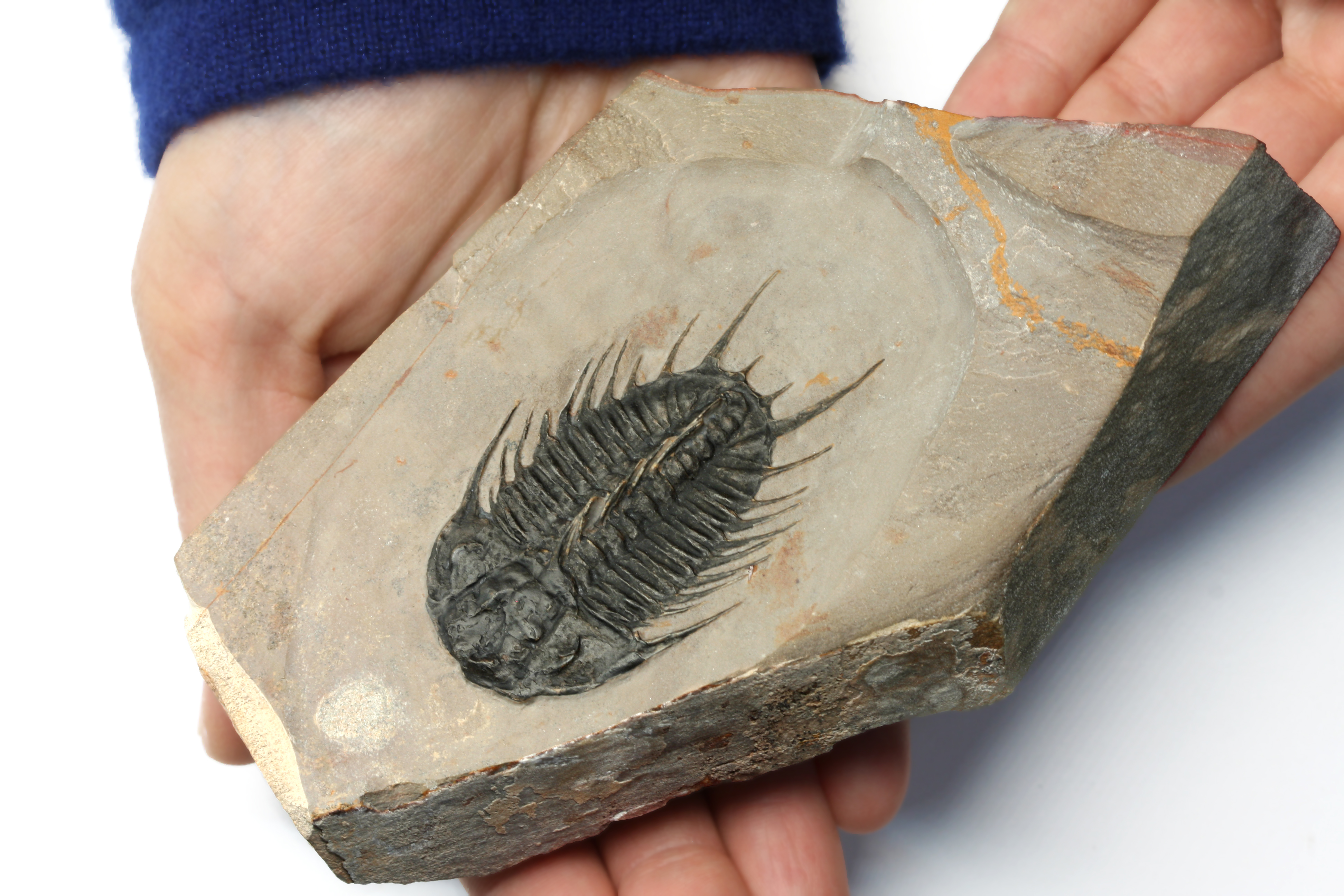 Highly sought after 6.5 cm Olenoides nevadensis trilobite from the Middle Cambrian rocks of Utah. These rare Corynexochid trilobites are legendary for their spiny morphology and association to the Burgess Shale site. This specimen is a textbook example, perfectly prone, with full rack of standing spines running the length of its thorax. The trilobite sits on a nice tan block of Wheeler Formation limestone, with black exoskeleton and orange highlights peeking through. There is some pathology to the right side of the trilobite with slight growth deformation and one pleural spine which has grown short and wide. With only a few specimens available each year, Olenoides trilobites are often collection centerpieces.