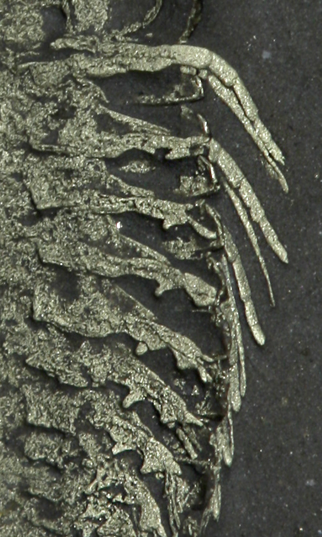 The lower specimen on the plate features near perfect preservation of all anatomy as existed some 450 million years ago. ย The underside of the of the cephalon is busy, with perfectly preserved features rarely seen even in exceptional specimens. The gnathobases (to crush food), the supposed metastome, the mouth area, antennae abductors and even the tiny fourth set of cephalic appendages are present. ย The thorax shows near perfect legs, some with visible tripartite claw tips. ย The pygidium is loaded with diminutive legs, lots of gill filaments and a rumored anal element extending from the rear (drawing on some of the more speculative portions of Cisne’s work in the 1970’s). ย The antennae are stunning on this one.